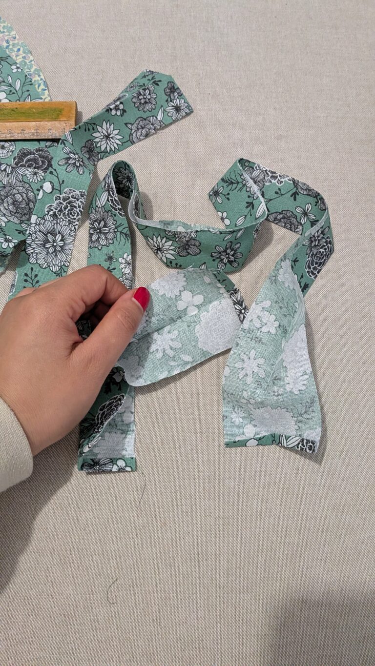 💡 Cette étape permet d’être précis dans le positionnement du tunnel. Si la bande est trop longue, vous pouvez la couper et refaire les bords pliés avant de continuer. Le cordon n’est pas encore passé à ce stade.