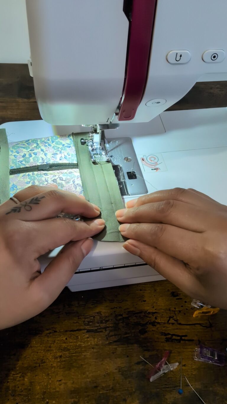 Avec la doublure visible (wrong side), cousez les côtés à ~3–4 mm du bord
